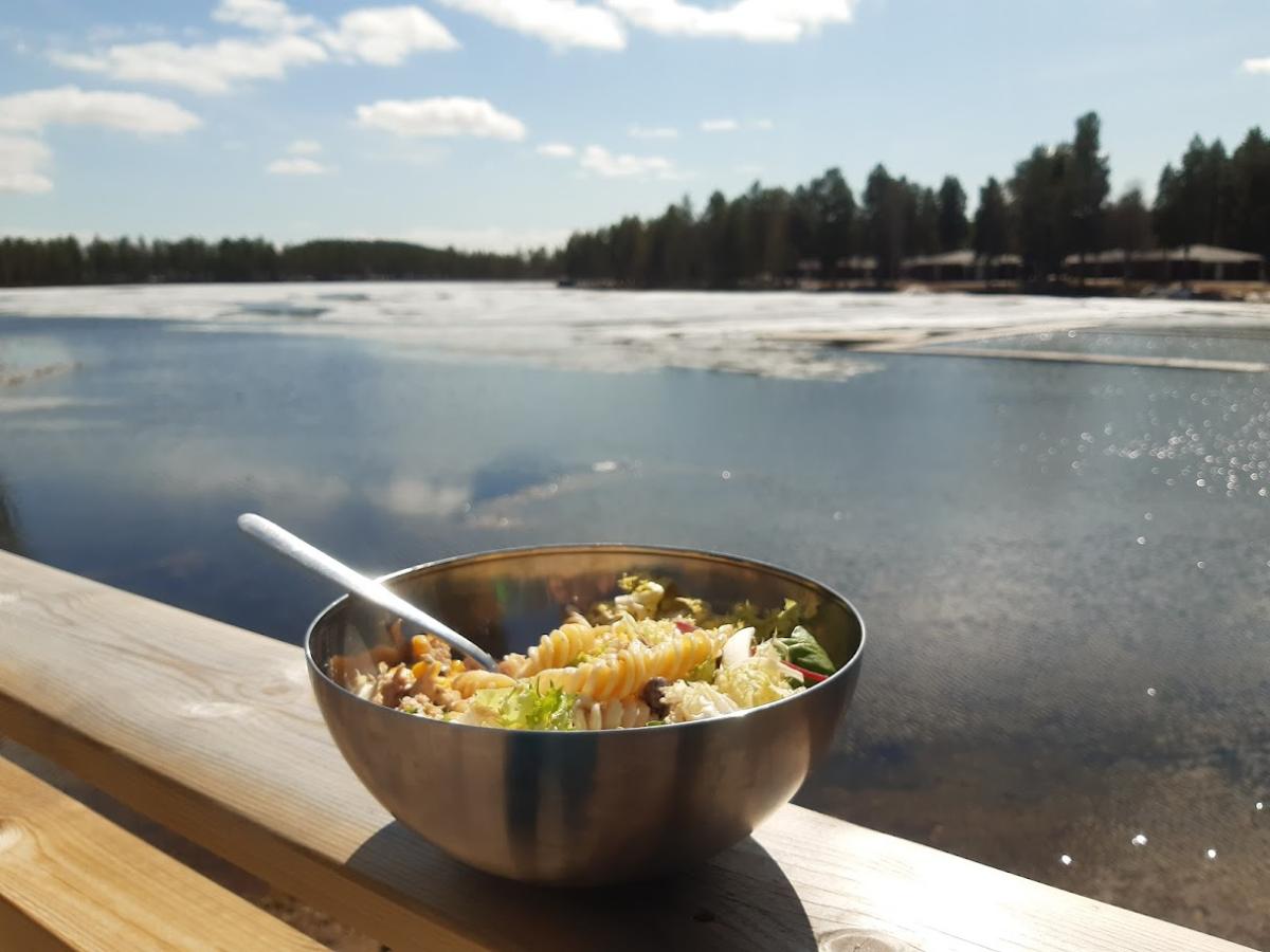 Pro oběd jsme si vybrali krásné místo přímo v Arvidsjaur na terase u jezera. Na vyhřáté terase se krásně leželo, na blízkém molu zas dobře kopalo s kousky ledu z jezera.