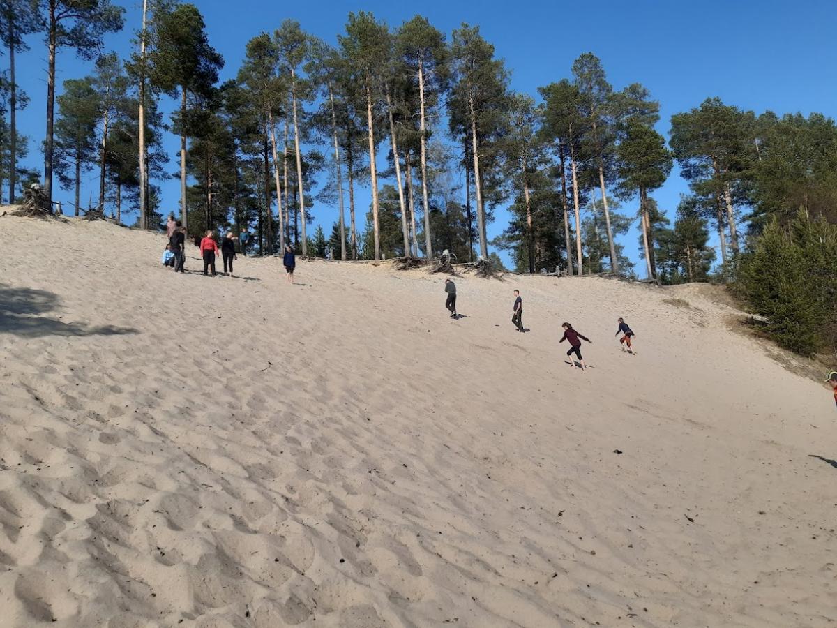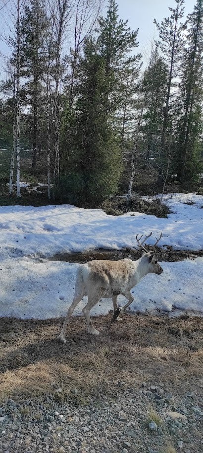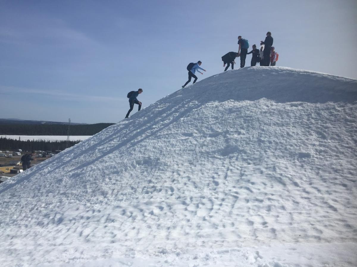 Zde jsme se rozhodli dojít na holý zasněžený kopec s výhledem na švédské Laponsko, od vnitrozemských zasněžených hor, přes železné doly a jejich odkaliště až po poledovcovou krajinu táhnoucí se k Botnickému zálivu a do Finska. Užili jsme si dost sněhových radovánek (koulování, sjíždění kopce na igelitce) na místní sjezdovce, sesbírali na památku místní pěkné šutry, potrápili se v hlubším propadajícím sněhu nebo se podívali na zázemí na vrcholu kopce či bývalý skokanský můstek.