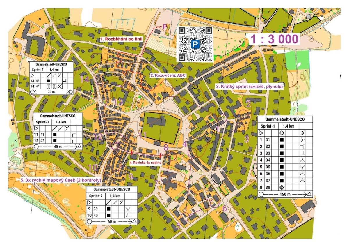 Dopolední trénink začal linií pro rozmapování a rozběhání. Po rozcvičení následoval krátký farstovaný hromaďák a vše završili 3 rychlé starty (3 velmi krátké okruhy v maximální rychlosti). Odpolední trénink byly přeběhy skrze kamenná moře.